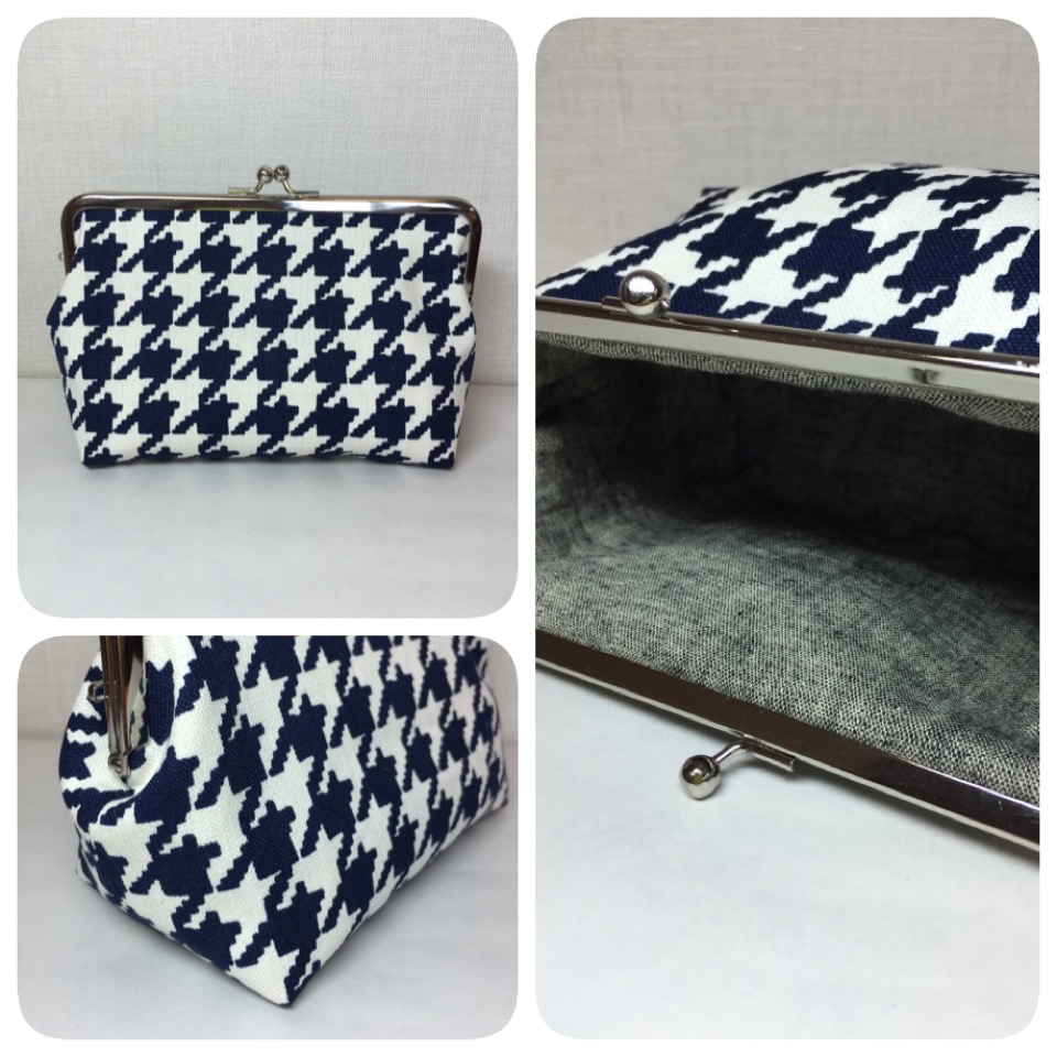 ネイビー大きめ千鳥格子 たっぷり入るがま口ポーチ